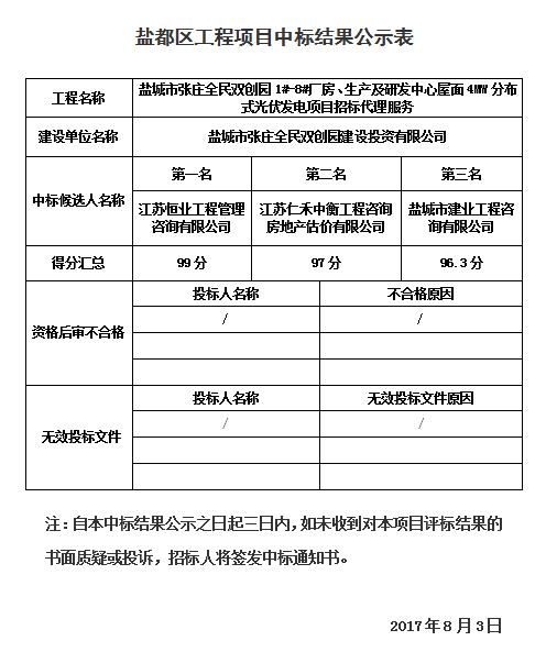 鹽城市張莊全民雙創(chuàng)園1#-8#廠房、生產(chǎn)及研發(fā)中心屋面4MW分布式光伏發(fā)電項目招標代理服務(wù)中標結(jié)果公示