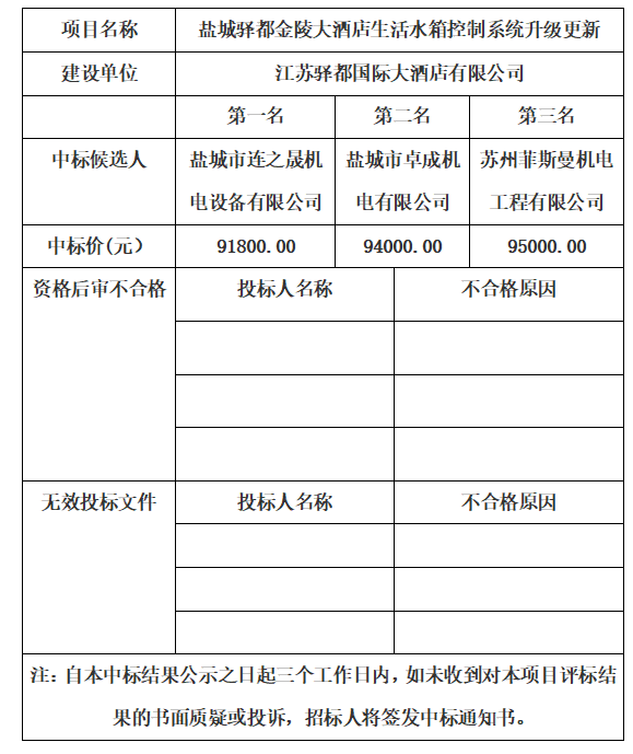 鹽城驛都金陵大酒店生活水箱控制系統(tǒng)升級更新詢價結果公示