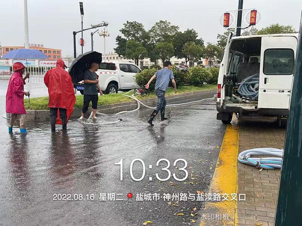 上午10點(diǎn),經(jīng)路面作業(yè)現(xiàn)場工作人員報(bào)告,在神州路與鹽瀆路交界處,最深積水達(dá)到15CM以上。應(yīng)急小分隊(duì)接到指令后,迅速駕駛車輛,運(yùn)載水泵、水管、鐵鍬等防汛物資,不到10分鐘就迅速趕到現(xiàn)場。在公司負(fù)責(zé)人劉鳳權(quán)、孫榮才等人的現(xiàn)場指揮下,搶險(xiǎn)人員立即查找造成堵塞積水的原因。經(jīng)過查找發(fā)現(xiàn),原來積水處只有一個(gè)下水道,無法快速排水。劉鳳權(quán)當(dāng)機(jī)立斷,指揮搶險(xiǎn)人員立即撬開附近窨井蓋,把水管放進(jìn)窨井,發(fā)動(dòng)水泵,往不遠(yuǎn)處的雨水井排水。這時(shí)雨越下越大,風(fēng)越刮越猛,搶險(xiǎn)隊(duì)員們冒著狂風(fēng)暴雨,不畏雷鳴電閃,齊心協(xié)力清理積水,有的發(fā)動(dòng)水泵梳理管道;有的用大掃帚清掃路面積水;有的清理積水中的垃圾雜物……隊(duì)員各司其職,分工合作,在時(shí)間緊迫、環(huán)境惡劣的情況下盡力完成排水作業(yè),經(jīng)過緊急搶排,道路恢復(fù)了通暢。