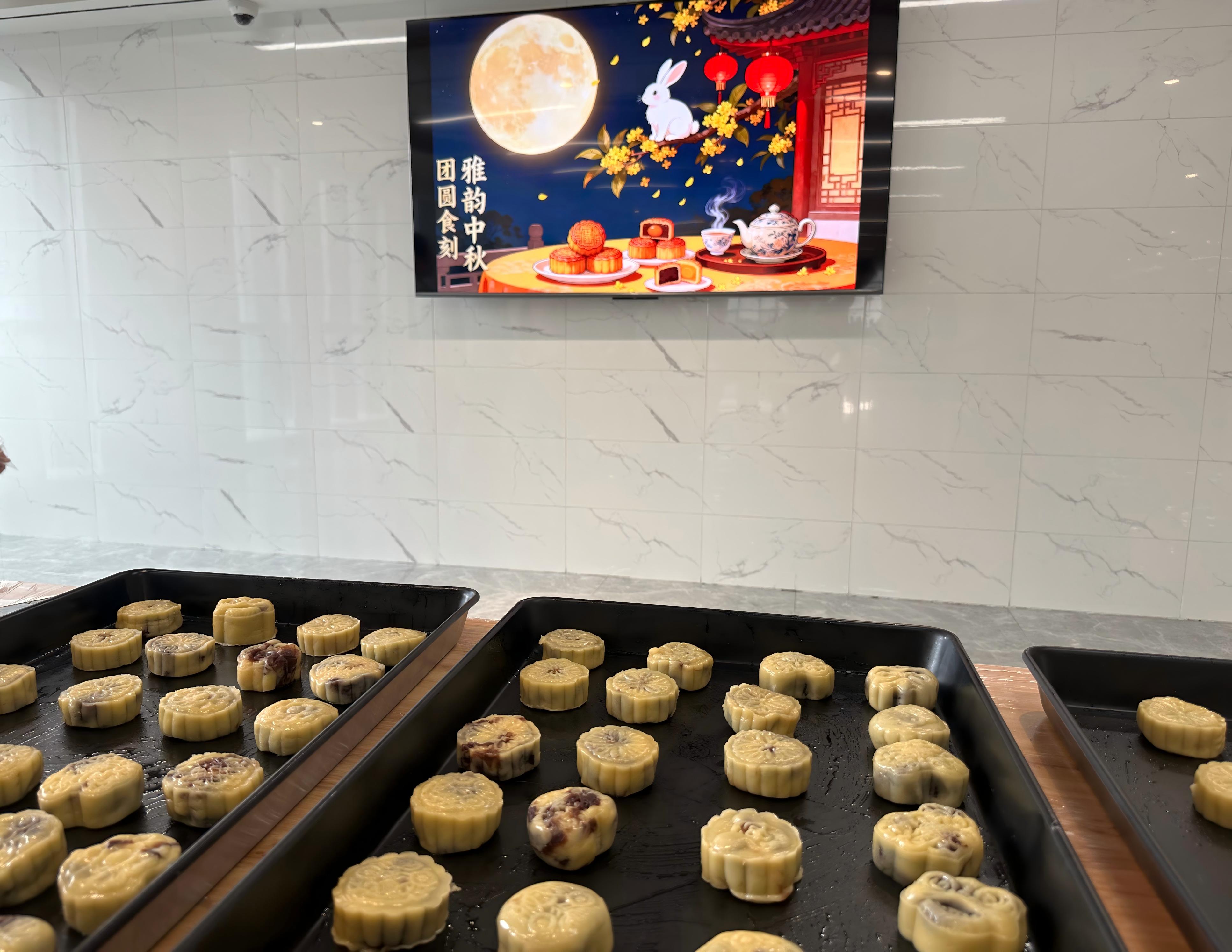 活動(dòng)現(xiàn)場(chǎng)布置得溫馨雅致,面團(tuán)、餡料、模具等材料早已備好,各處充滿(mǎn)了濃厚的節(jié)日氣息。在面點(diǎn)師傅的指導(dǎo)下,大家興致勃勃地投入到月餅制作中,揉搓面團(tuán)、包入餡料、放入模具……同事們互相交流技巧,分享心得,一個(gè)個(gè)飽滿(mǎn)可愛(ài)的月餅在手中成型。