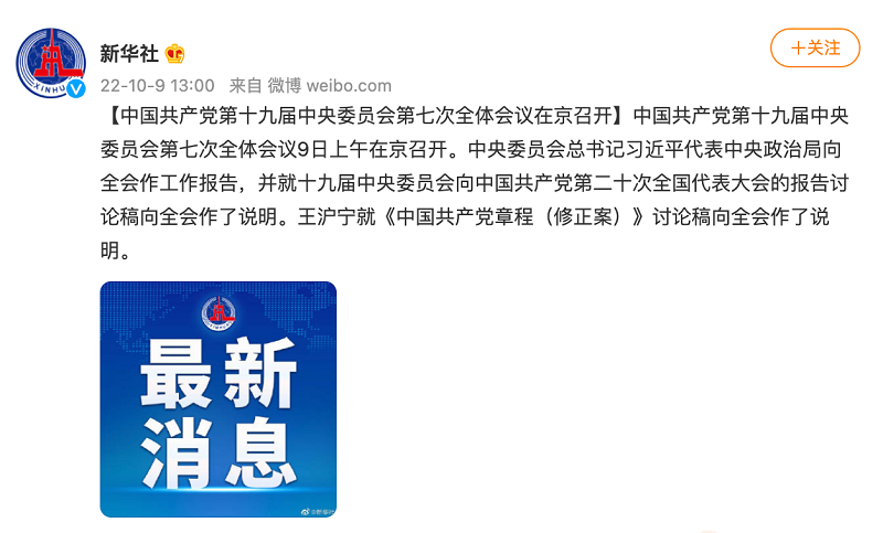 【中國共產(chǎn)黨第十九屆中央委員會(huì)第七次全體會(huì)議在京召開】中國共產(chǎn)黨第十九屆中央委員會(huì)第七次全體會(huì)議9日上午在京召開。中央委員會(huì)總書記習(xí)近平代表中央政治局向全會(huì)作工作報(bào)告,并就十九屆中央委員會(huì)向中國共產(chǎn)黨第二十次全國代表大會(huì)的報(bào)告討論稿向全會(huì)作了說明。王滬寧就《中國共產(chǎn)黨章程(修正案)》討論稿向全會(huì)作了說明。